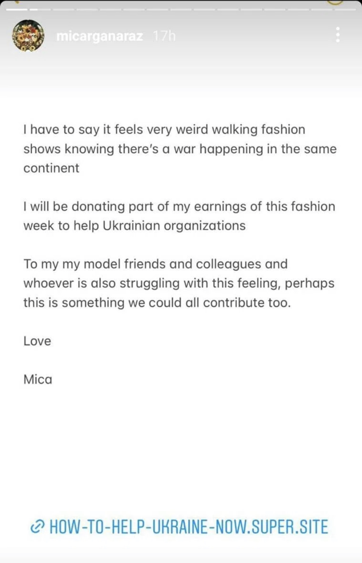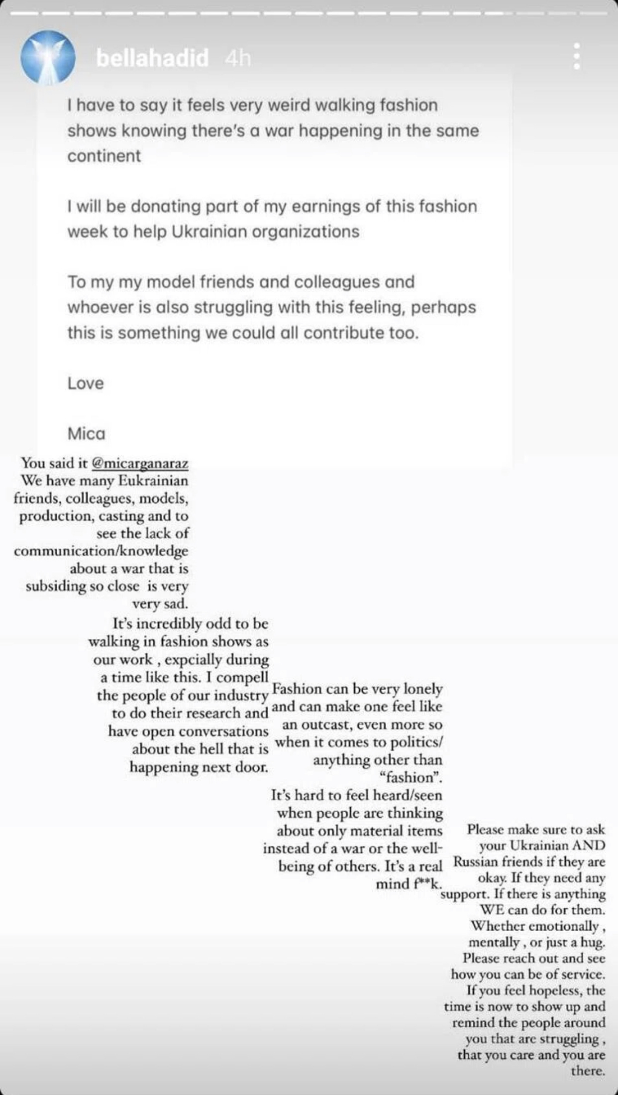 Hadid e bëri njoftimin në mbështetje të koleges së saj modeles Mica Argañaraz, 29 vjeç, e cila shkoi në Instagram: “Unë do të dhuroj një pjesë të fitimeve të mia të kësaj jave të modës për të ndihmuar organizatat ukrainase. Për miqtë dhe kolegët e mi modele dhe këdo që po ashtu po lufton me këtë ndjenjë, ndoshta kjo është diçka në të cilën të gjithë mund të kontribuojmë”.