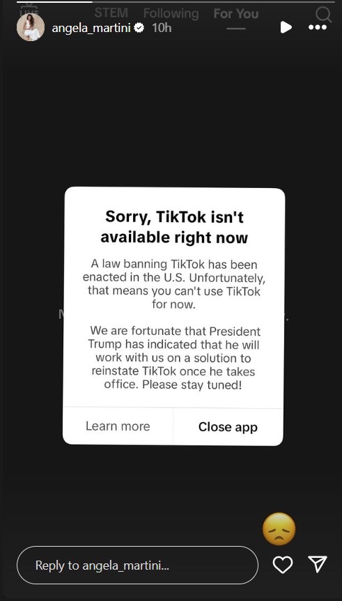 E sigurisht nga ky vendim janë prekur edhe vip-at tanë të cilët jetojnë në Shtetet e Bashkaura të Amerikës. Ka qenë bukuroshja jonë, Angela Martini ajo e cila në llogarinë e saj në “Instagram”, ka postuar një “screenshot” ku njoftohet se “TikTok” nuk është më i aksesueshëm.