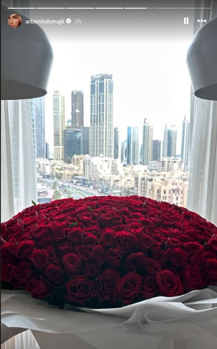 Arbenita postoi në Instagram një foto të një buqete me lule pranë një dritareje me pamje të mrekullueshme nga Dubai, duke ngritur dyshime se mund të jetë në një romancë të re, megjithatë ajo nuk ka konfirmuar një lidhje të tillë.