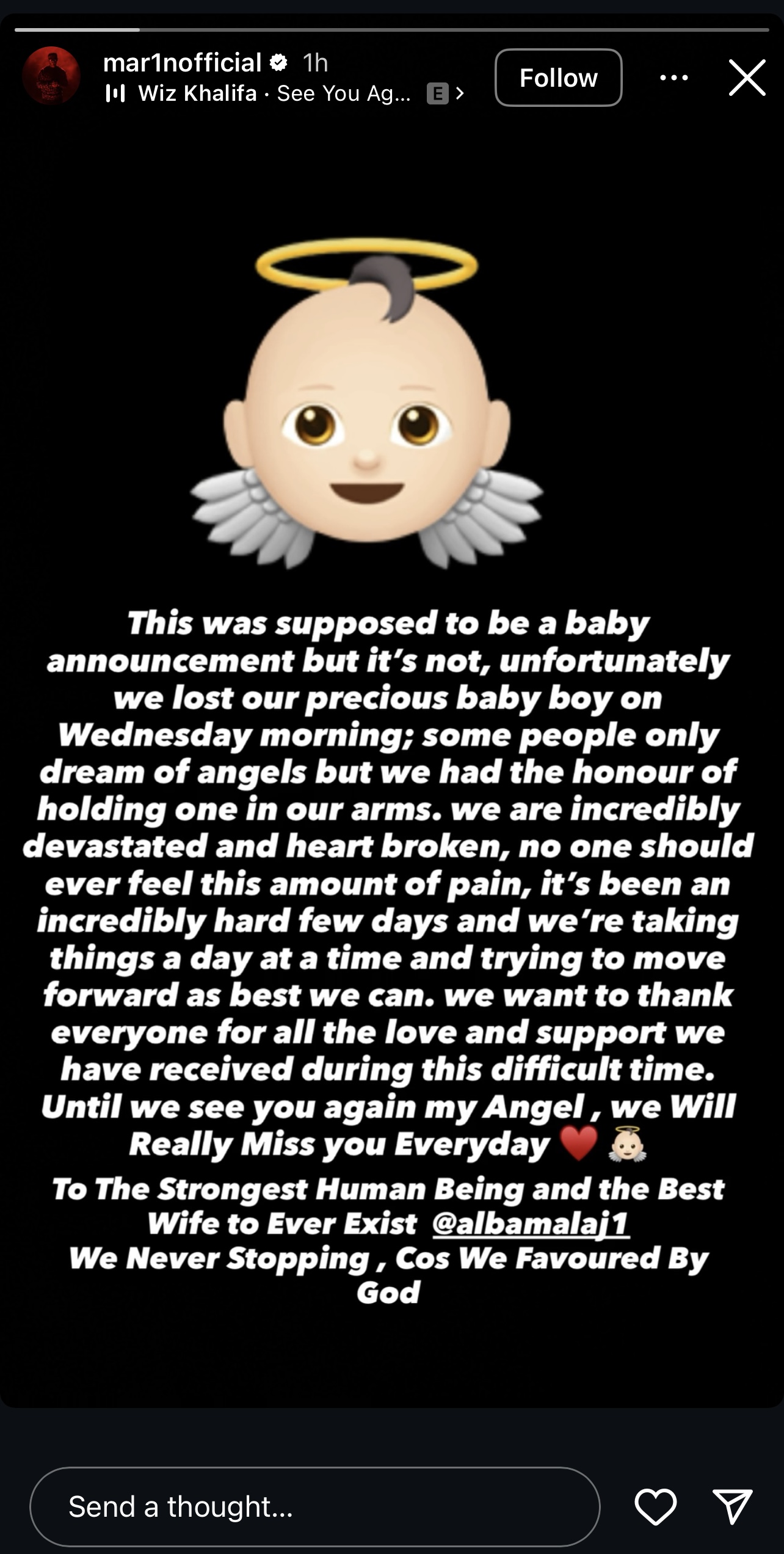 Në statusin e tij, Marin shprehet se kjo ishte menduar të ishte një lajm i gëzueshëm për ardhjen në jetë të vogëlushit, por fatkeqësisht jeta ka marrë një kthesë të dhimbshme për familjen e tij.