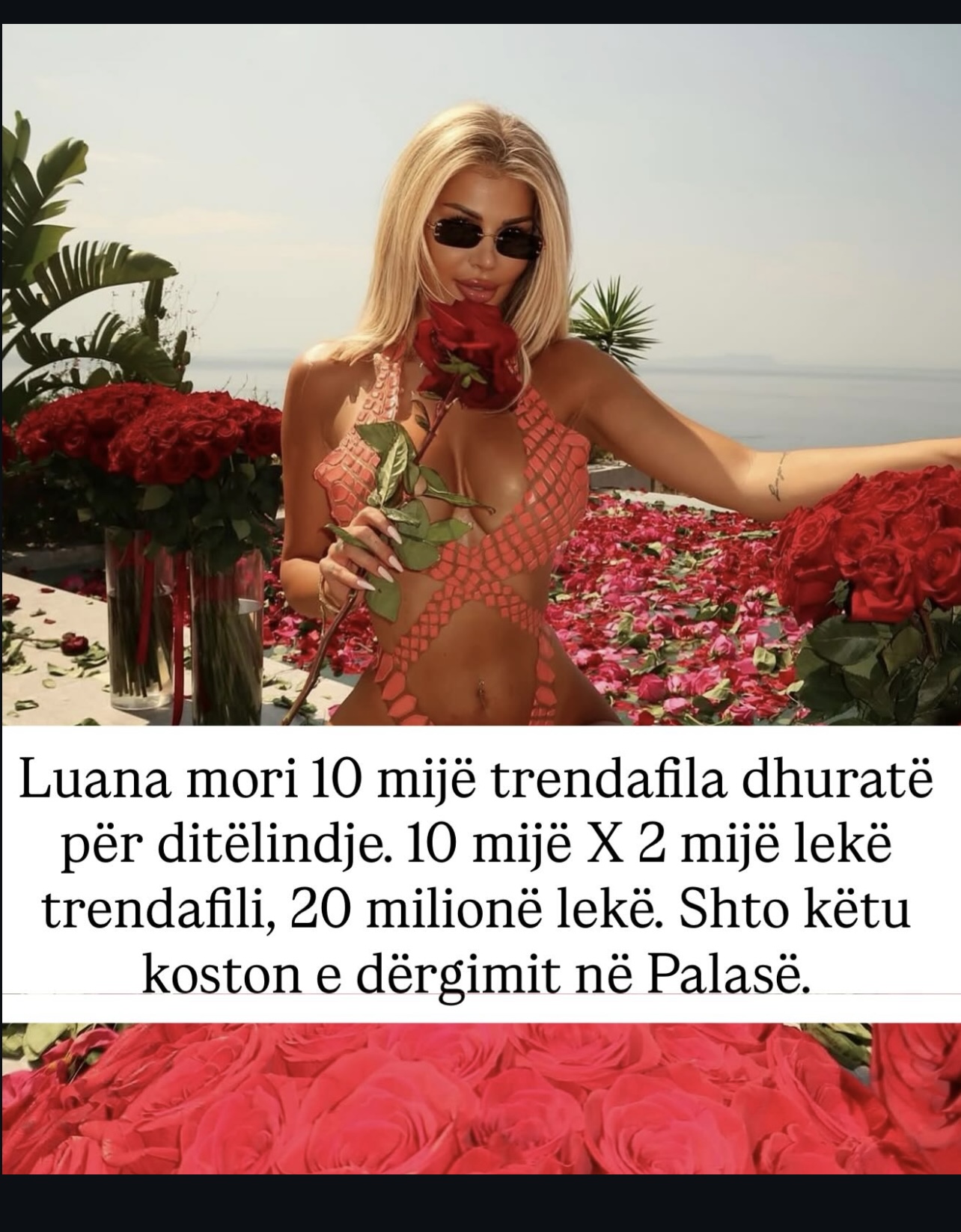 “Faleminderit” gazetarit Ronaldo Sharka që na ndriçoi. Jo me ndonjë investigim, jo me ndonjë analizë të thelluar të krizës ekonomike apo jetës së vështirë të rinisë shqiptare. Jo, përkundrazi. Na dha një leksion dashurie. Dhe më konkret s’e bënim dot: 10 mijë trendafila, nga 2 mijë lekë copa, dërguar në Palasë. 20 milionë lekë. Dashuri në pakicë.