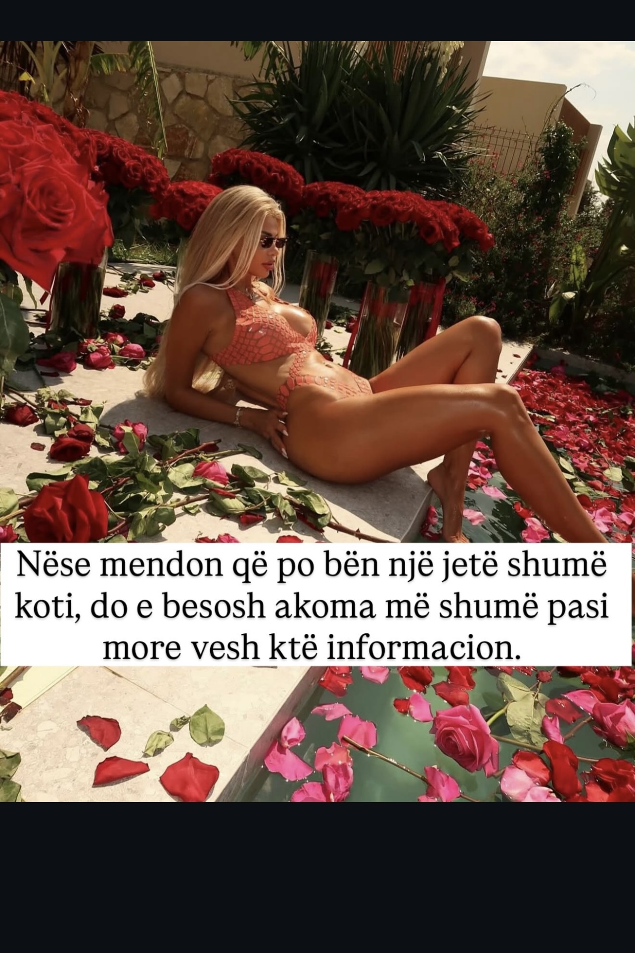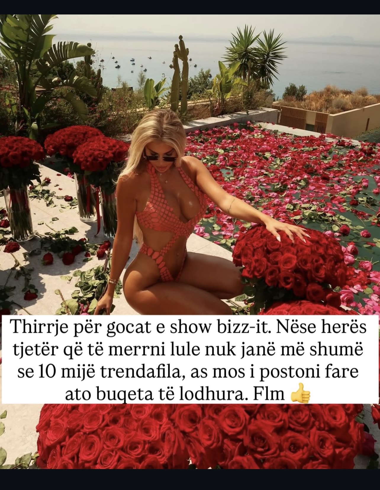 Ky është humori tragjik i ditëve tona. Në vend që figura publike të përdorin ndikimin e tyre për të promovuar ndjenja të vërteta, respektin, përpjekjen, ato promovojnë fjalë për fjalë konsumizmin emocional. Dashuria shndërrohet në një garë e shëmtuar për like, për klikime dhe për buqeta gjithnjë e më të mëdha – derisa të mbulojnë realitetin bosh poshtë tyre.