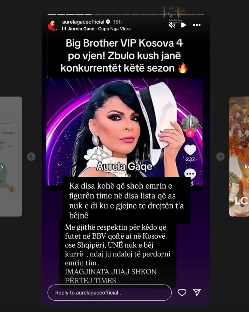 Këngëtarja e njohur Aurela Gaçe ka bërë një postim në storz në isntagram ku shfaqet mjaf e revoltuar me aludimet e disa portale që ai do të jetë pjesë e Big Brother Vip Albania. Për këtë edicion që do të vijë emri i Aurelës është lakuar shumë në media dhe rrjetet sociale që ajo do të jetë pjesë e Bigut dhe duket se kjo që e ka lodhur shumë këngëtaren sa e ka “detyruar” që të bëj një reagim publik për këtë fakt.