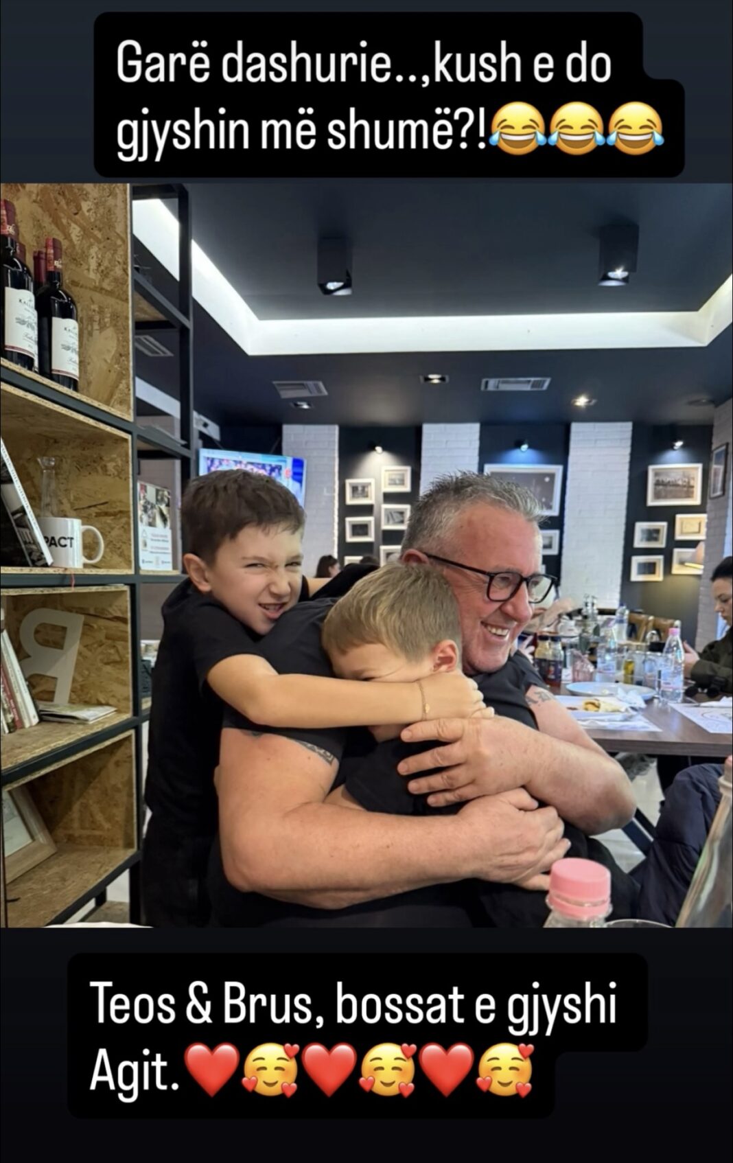 Aktori i njohur i humorit dhe skenës shqiptare, Agron Llaka, ka ndarë me ndjekësit e tij një moment të mbushur me dashuri familjare. Në foton e postuar në rrjete sociale, Llaka shihet i lumtur teksa përqafohet nga dy nipat e tij, një çast plot ngrohtësi që ka prekur zemrat e fansave.