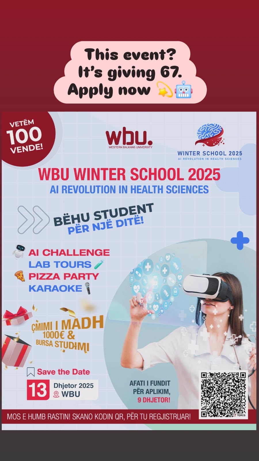 Western Balkans University ka njoftuar hapjen e aplikimeve për “WBU Winter School 2025”, një aktivitet që këtë vit vjen me temën AI Revolution in Health Sciences. Eventi do të zhvillohet më 13 dhjetor 2025 në kampusin e universitetit dhe ofron vetëm 100 vende për të interesuarit.