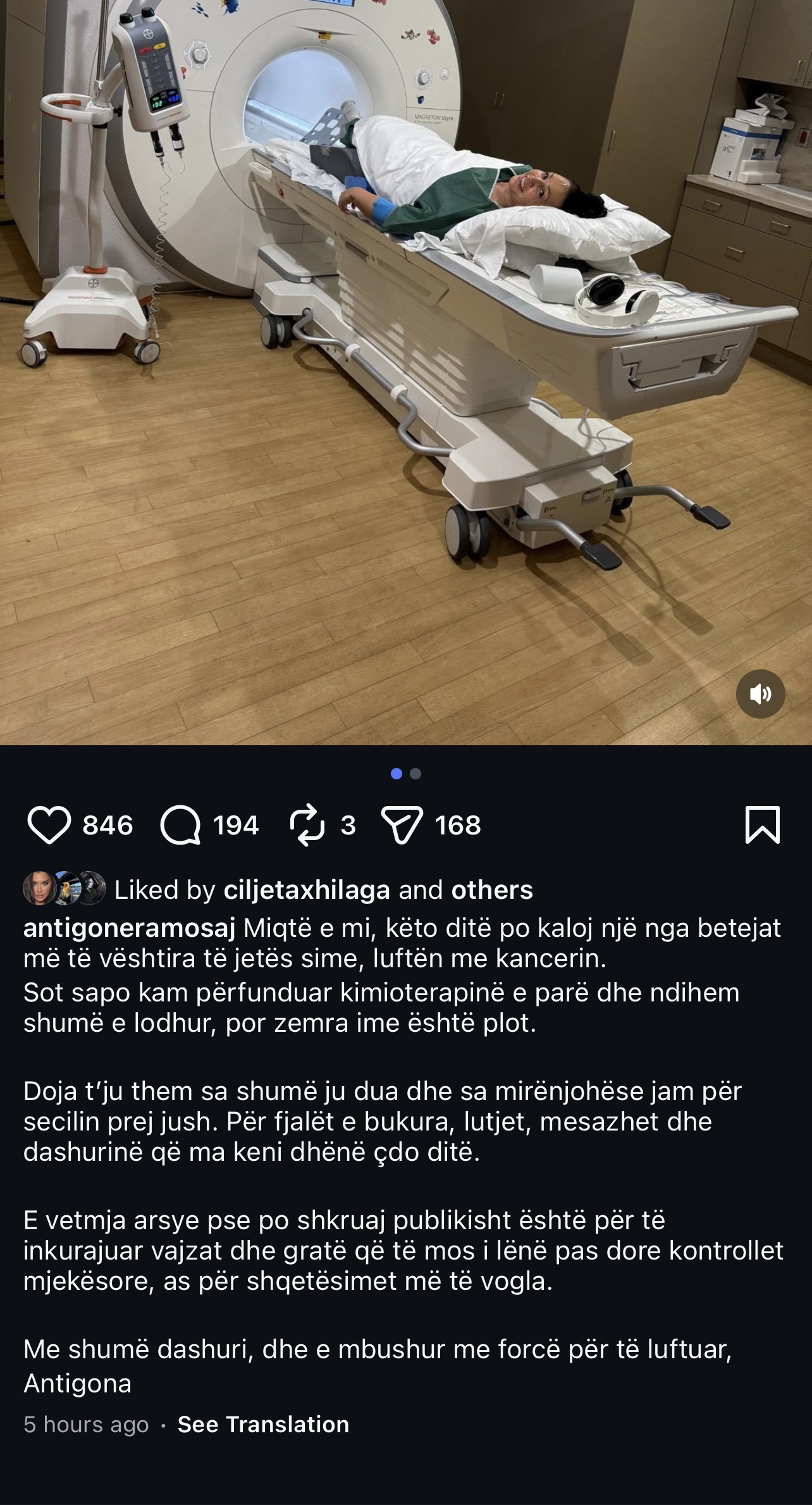 Përmes një postimi emocional, Antigona tregon se ka përfunduar kimioterapinë e parë, një etapë e vështirë që e ka lënë fizikisht të lodhur, por me zemrën plot mirënjohje dhe forcë. Ajo shpreh falënderimin e thellë për të gjithë ata që e kanë mbështetur me fjalë të mira, lutje, mesazhe dhe dashuri të përditshme.
