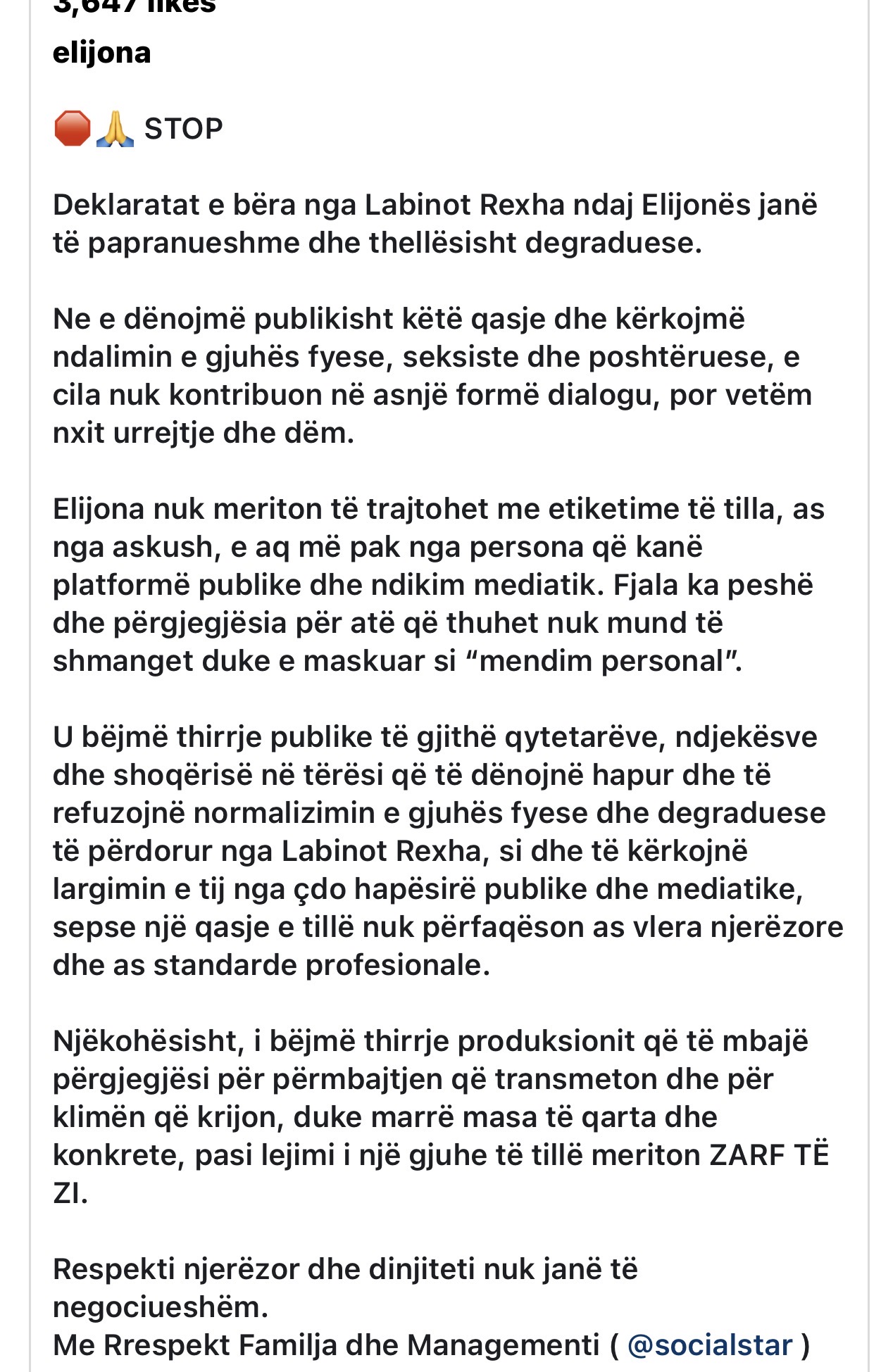 Përmes një postimi në faqen zyrtare të Elijonës në Instagram, familja dhe menaxhmenti i saj kanë dënuar publikisht qasjen e Labit, duke e cilësuar atë si “të papranueshme dhe thellësisht degraduese”.