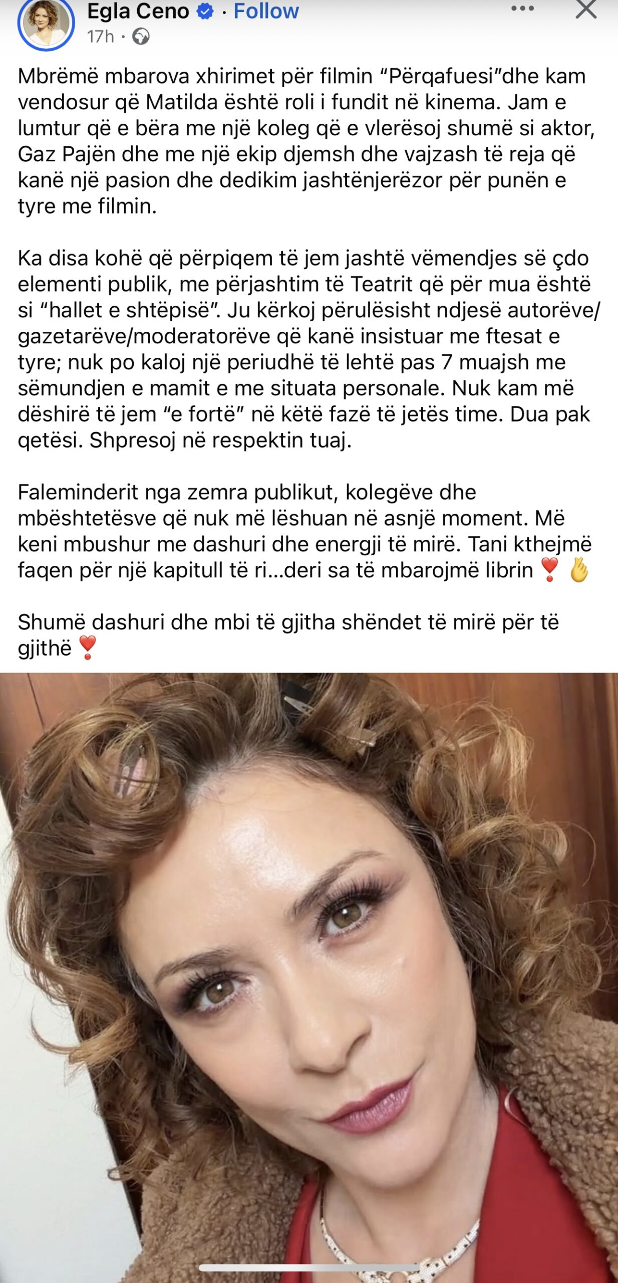 “Ka disa kohë që përpiqem të jem jashtë vëmendjes publike, përveç teatrit që për mua është si ‘hallet e shtëpisë’. Nuk po kaloj një periudhë të lehtë pas 7 muajsh me sëmundjen e mamit dhe situata personale. Nuk kam më dëshirë të jem ‘e fortë’. Dua pak qetësi dhe shpresoj në respektin tuaj.”